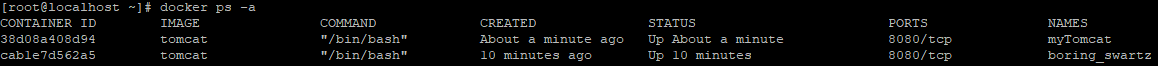 | > docker attach myTomcat or > docker attach 38d08a408d94 |