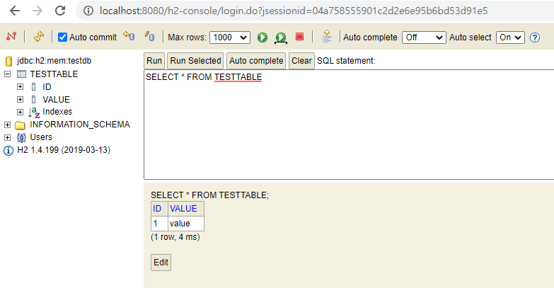 String sql1 = "CREATE TABLE TESTTABLE(ID INTEGER NOT NULL, VALUE VARCHAR(255), PRIMARY KEY (ID) )";