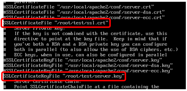 | SSLCertificateFile "path" SSLCertificateKeyFile "path" # SSLCACertificateFile "path" // 체이닝이 필요할 경우 설정 |