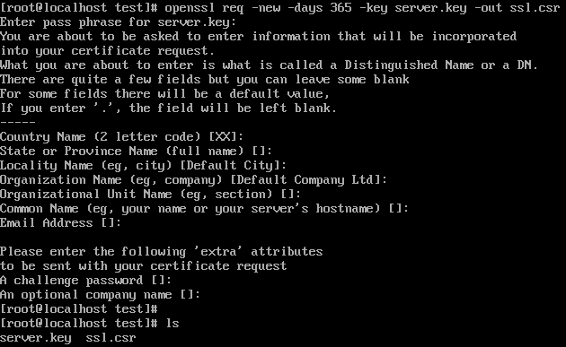 | > openssl req -new -days 365 -key server.key -out ssl.csr |