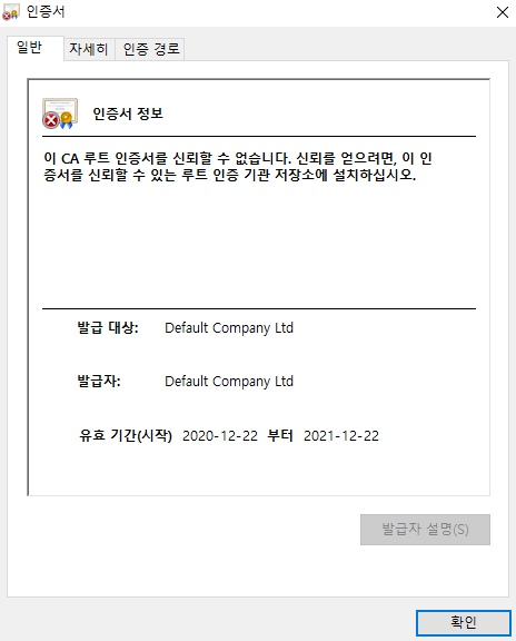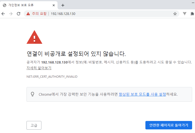 신뢰할 수 없는 인증서이기에 처음엔 위 처럼 뜬다