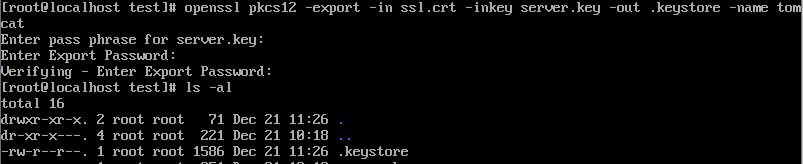 | > openssl pkcs12 -export -in ssl.crt inkey server.key -out .keystore -name tomcat |