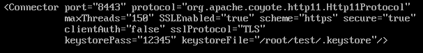 | <Connector port="%PORT_NUMBER%" protocol="org.apache.coyote.http11.Http11Protocol" maxThreads="150" SSLEnabled="true" scheme="https" secure="true" clientAuth="false" sslProtocol="TLS" keystorePass="%PASSWORD%" keystoreFile="%KEYSTORE_FILE_PATH%"/> |